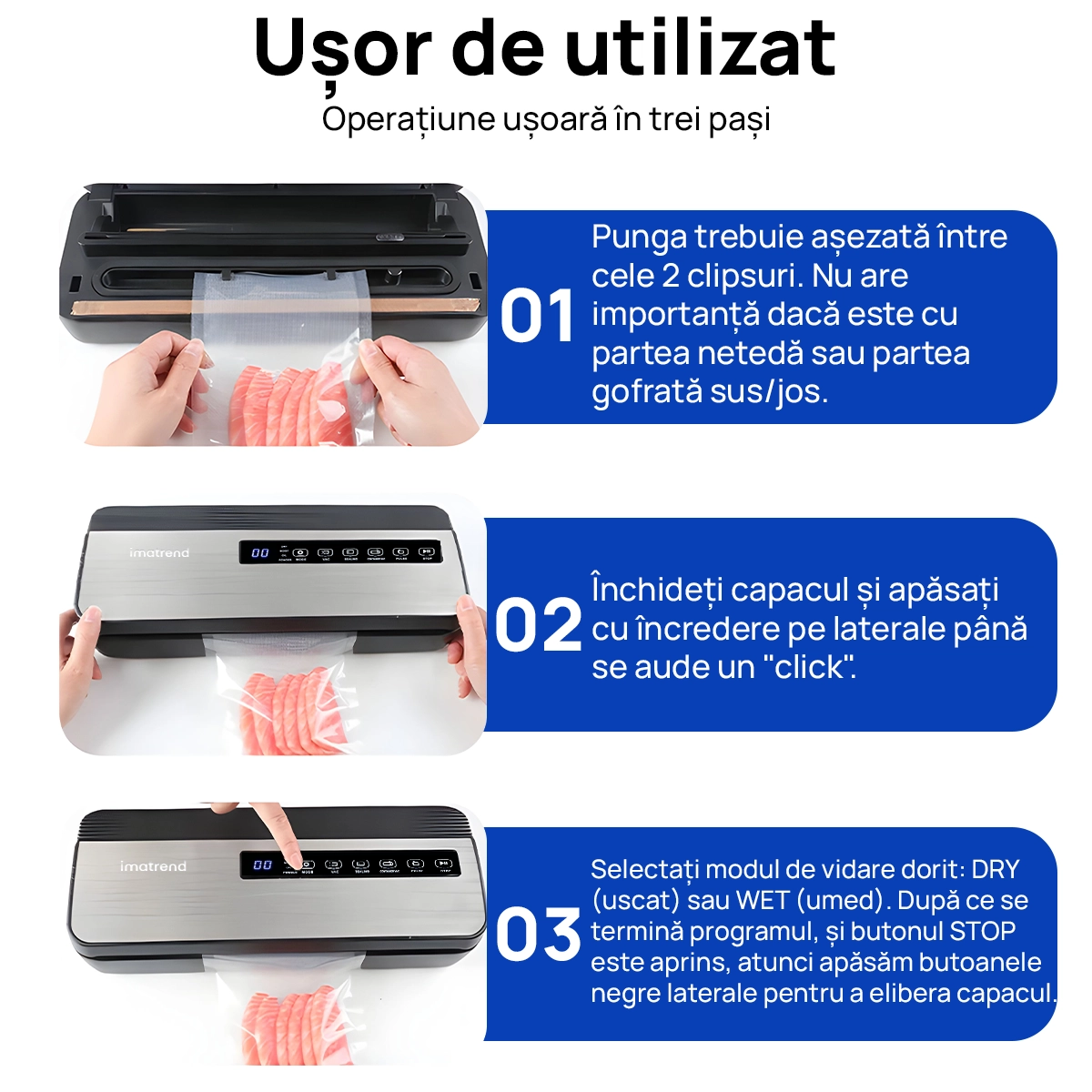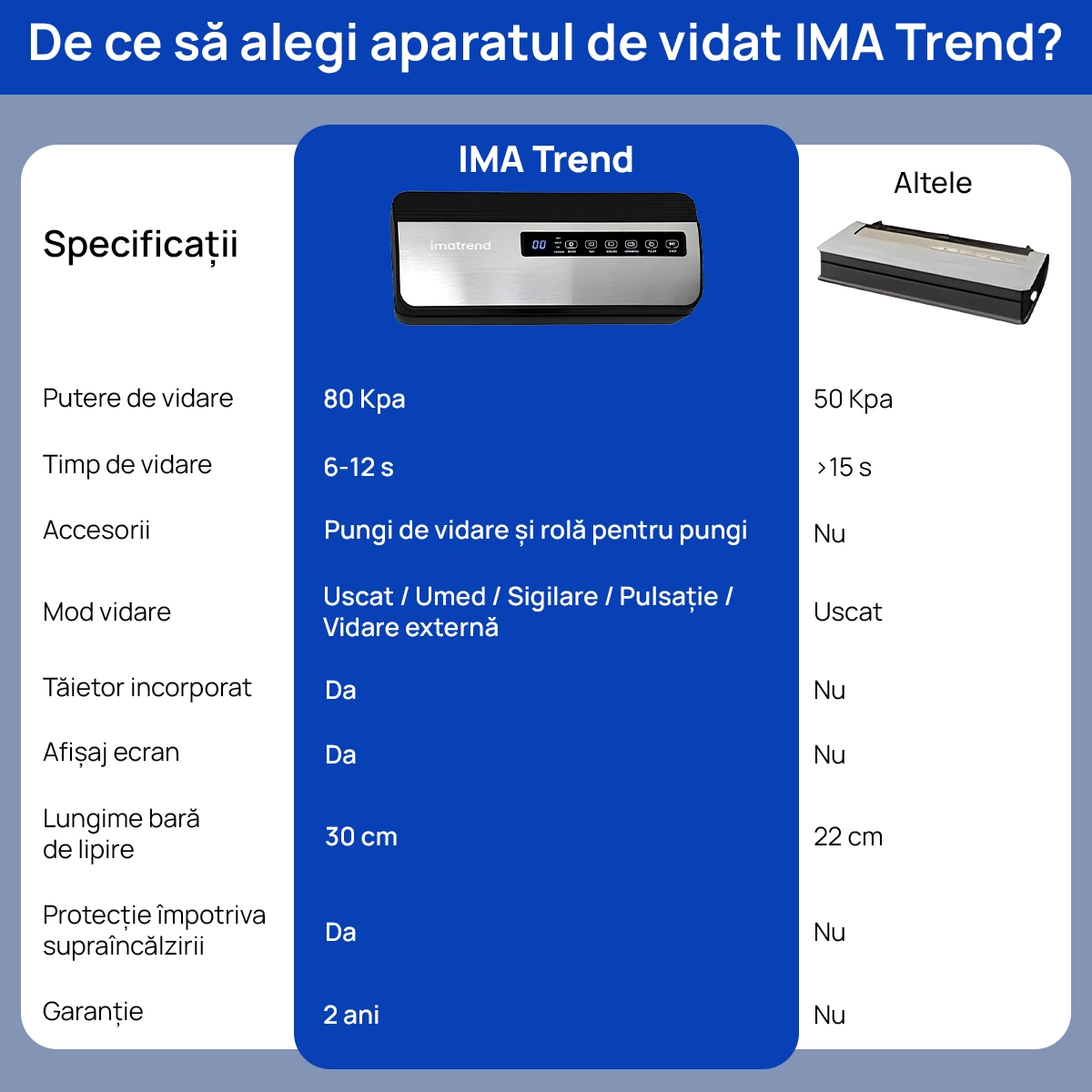 195 de recenzii pentru Aparat de Vidat IMA Trend – 130W, 80kpa, 30cm, Furtun caserole, Cutter, Pungi si Rola Incluse