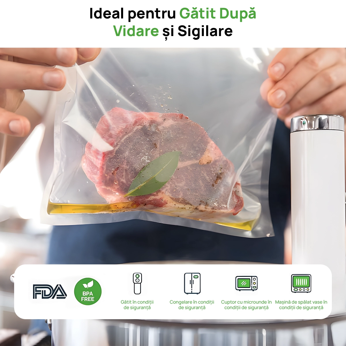 Pachetul contine 10 pungi si o rola de 25cm x 500 cm, astfel incat il poti folosi imediat pentru congelare, sous-vide sau organizare in bucatarie.