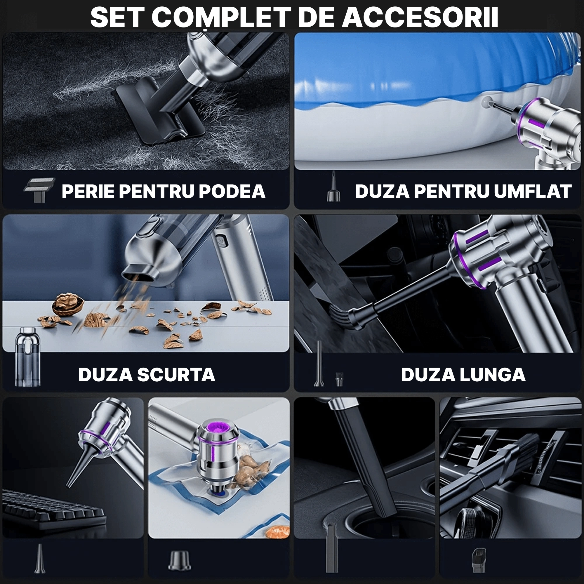 Aspirator auto si casnic 4 in 1 IMA Trend®, portabil si fara fir, cu motor de 100W, 3 viteze si putere de aspirare 15000 Pa. Dotat cu functie de suflare, filtru HEPA lavabil si baterie de 6000 mAh cu incarcare USB-C. Ideal pentru masina, casa si spatii greu accesibile.