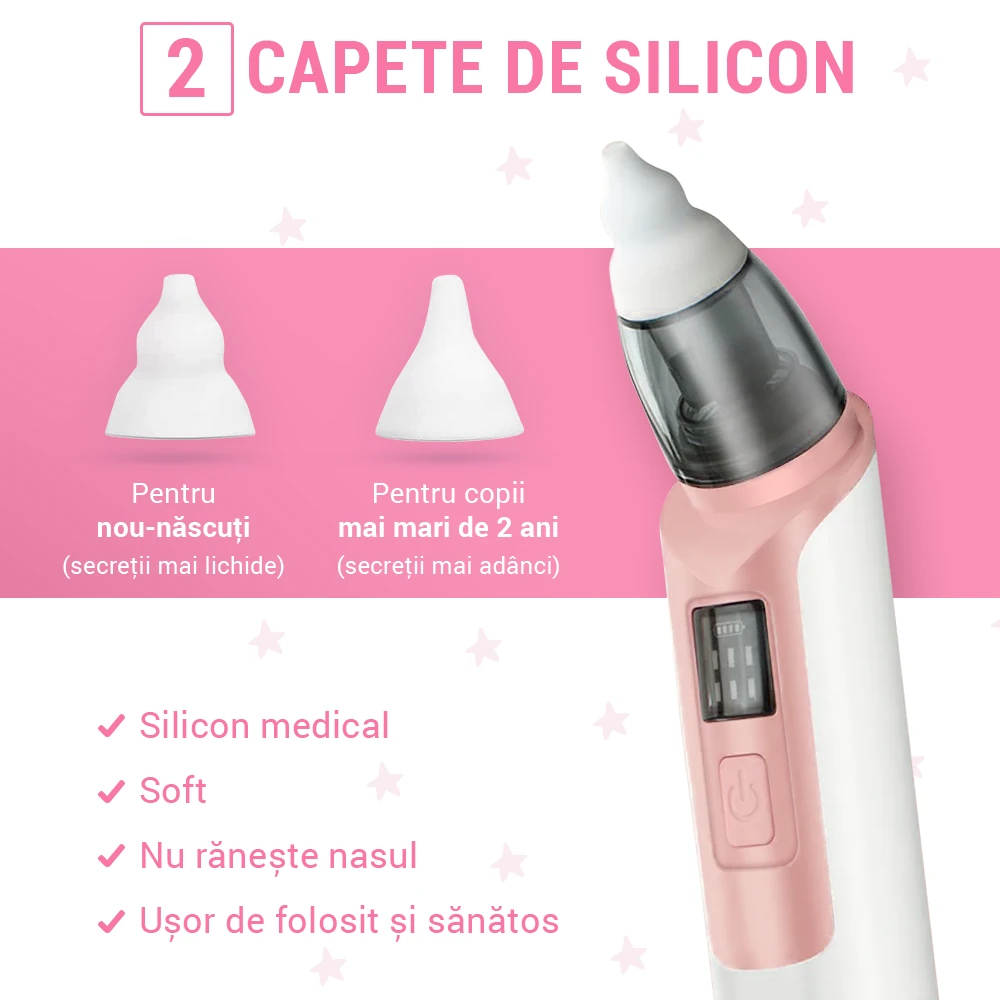 724 de recenzii pentru Aspirator nazal electric IMA Baby pentru bebelusi si copii silentios, 6 Trepte de Aspirare, Portabil, cu Incarcare USB, cu Baterie reincarcabila 500mAh, 2 Capete de silicon, roz