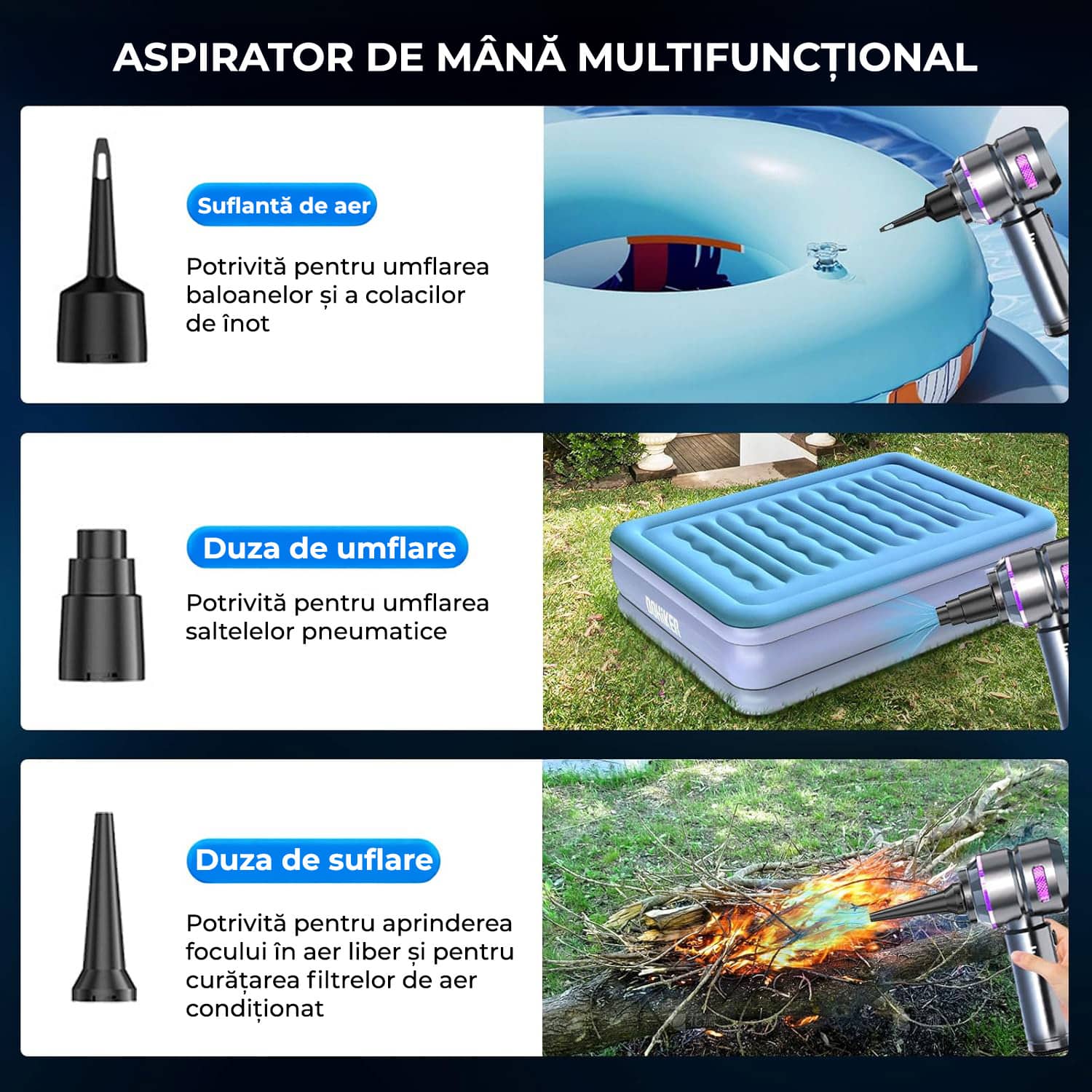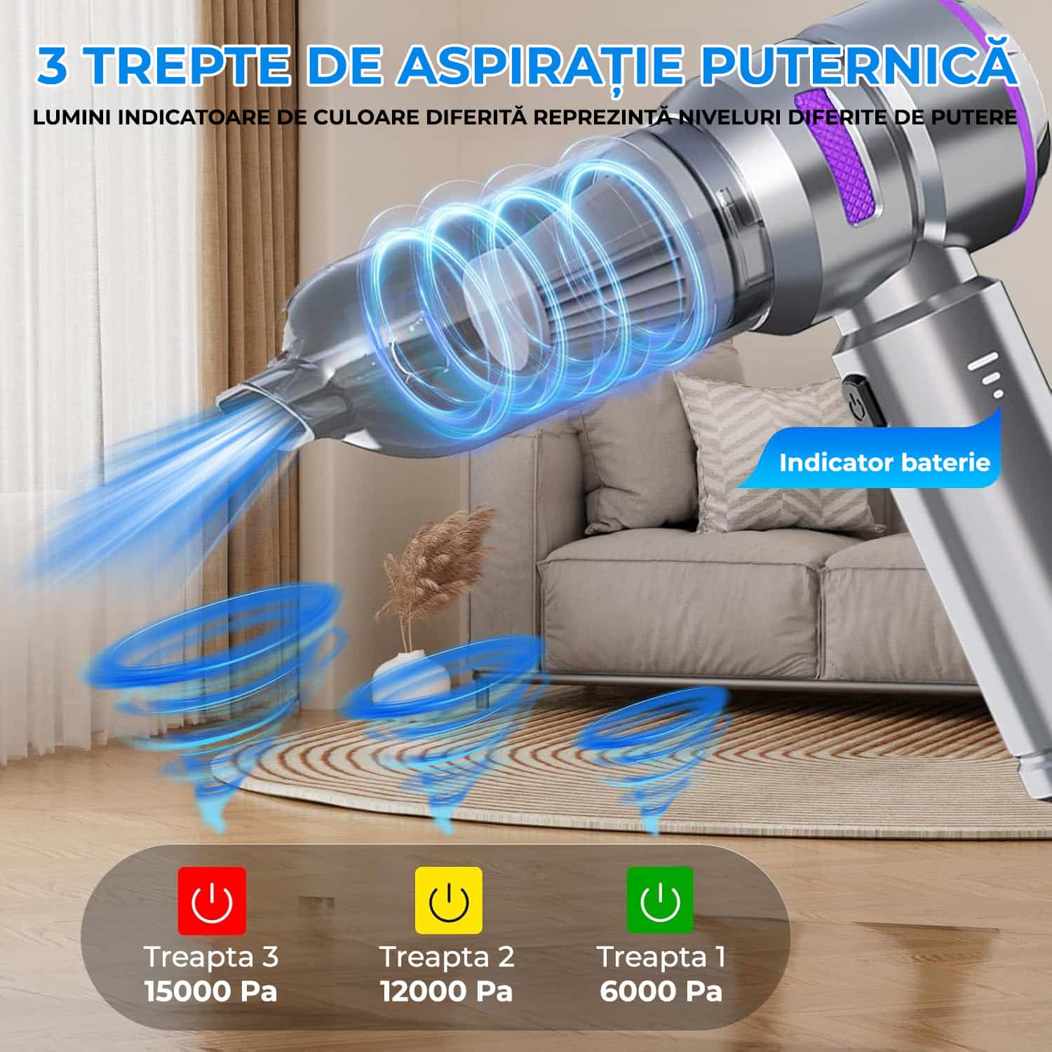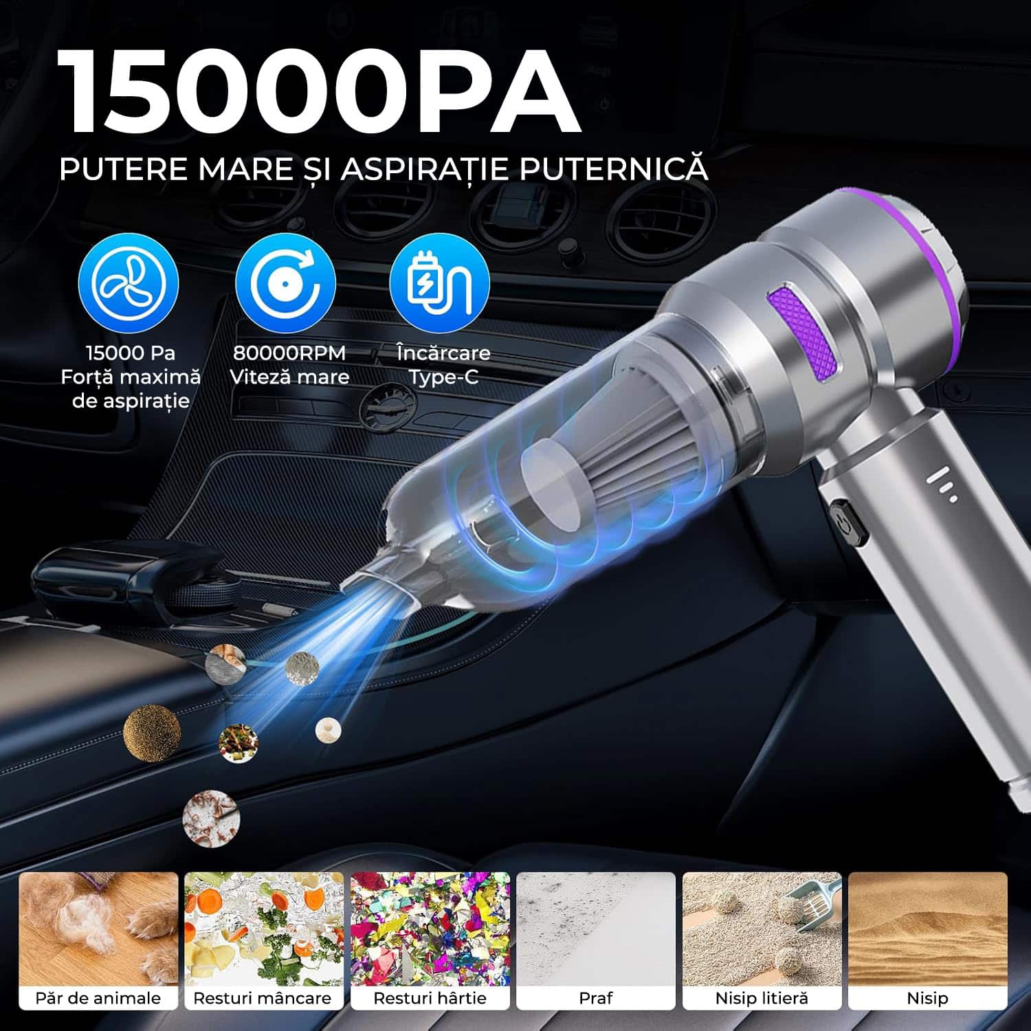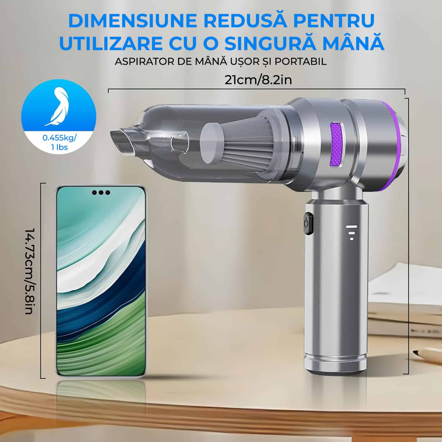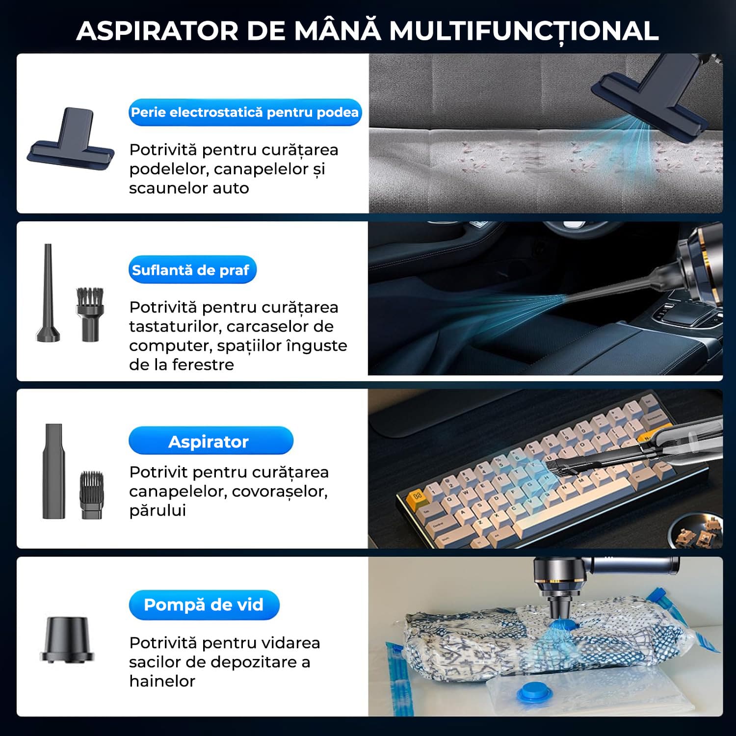 Aspirator portabil 4 în 1 IMA Trend ST Plus – curățenie rapidă și eficientă acasă sau în mașină. Motor puternic de 100W, 3 viteze, presiune 15000 Pa, filtru HEPA lavabil, funcție de suflare și aspirare. Autonomie mare cu acumulator de 6000 mAh și încărcare Type-C. Design modern, compact, ușor de folosit oriunde.