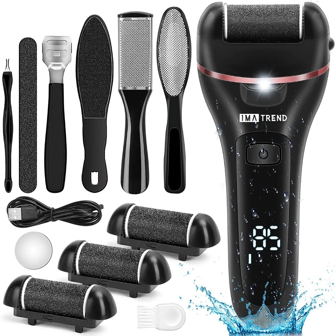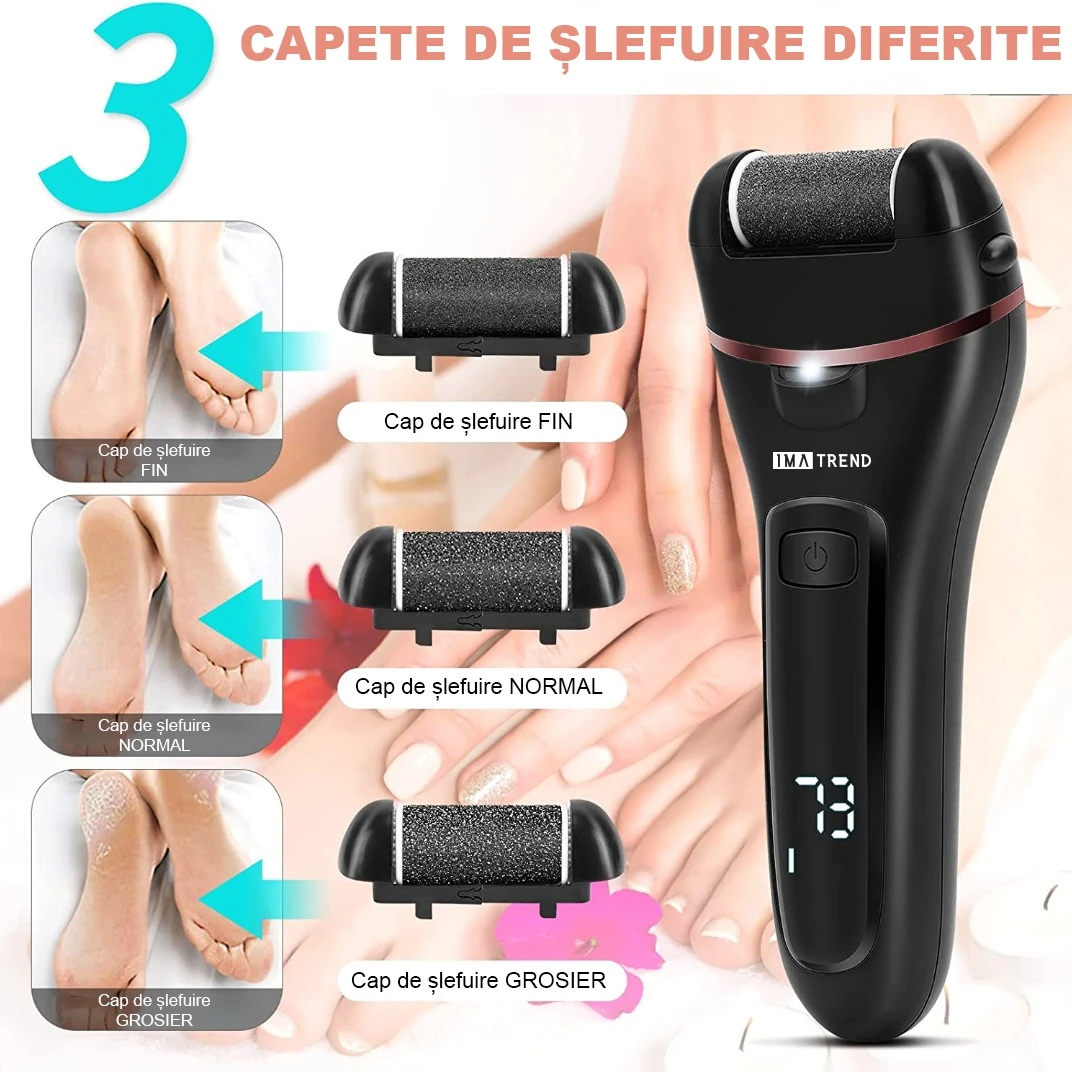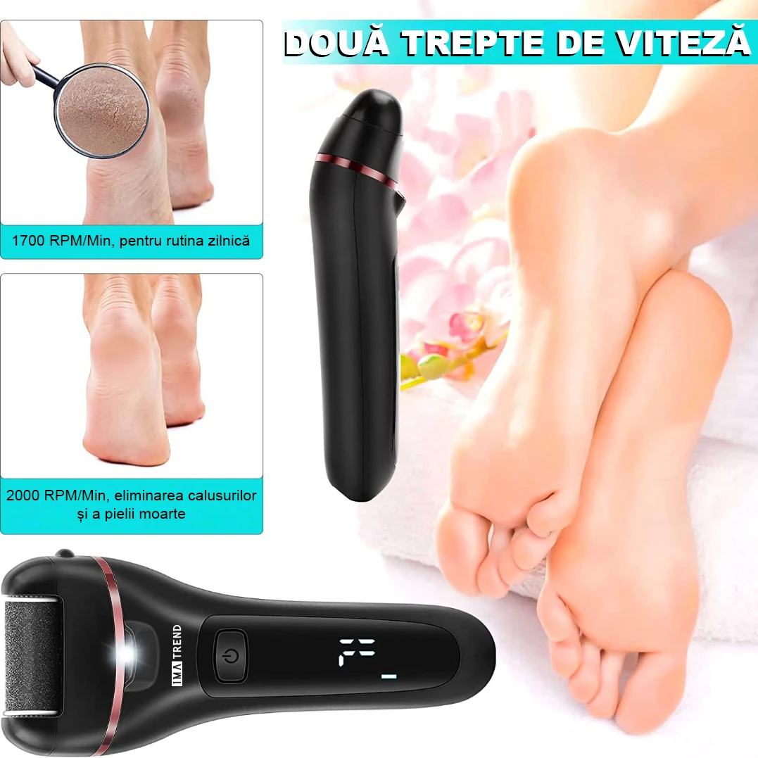 Pila electrica pentru talpi si calcaie IMA Trend cu display digital LED, 3 role abrazive, 2000 rpm, acumulator reincarcabil de 1200mAh si incarcare USB. Impermeabila si ideala pentru indepartarea pielii moarte acasa. Cadoul perfect pentru ingrijirea picioarelor.