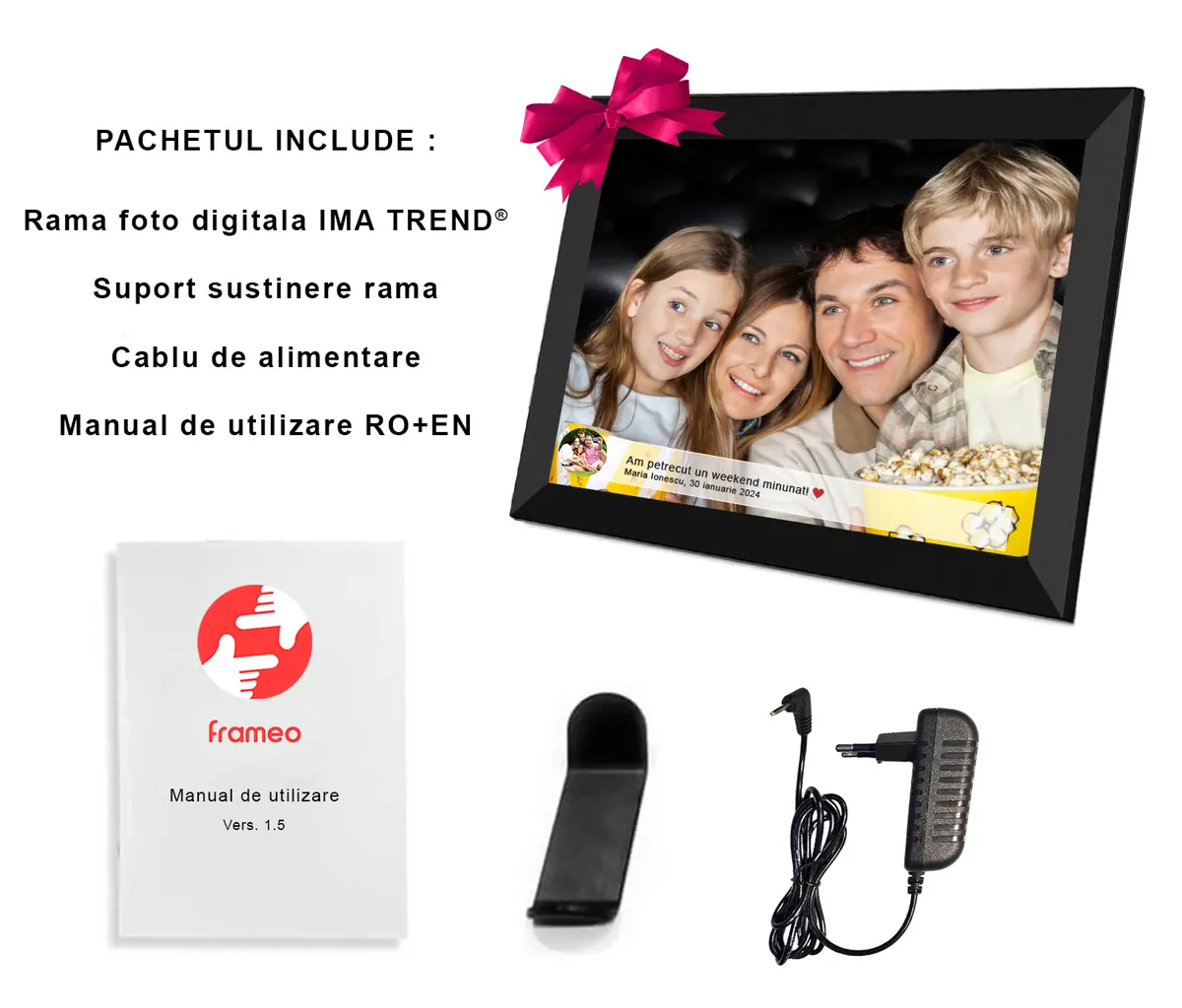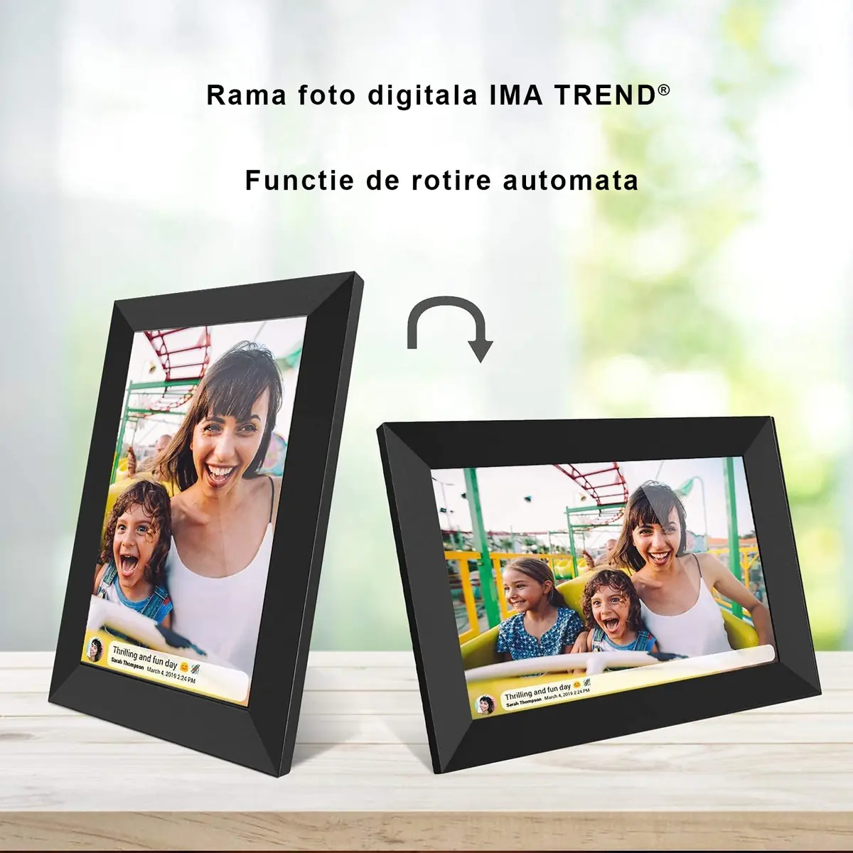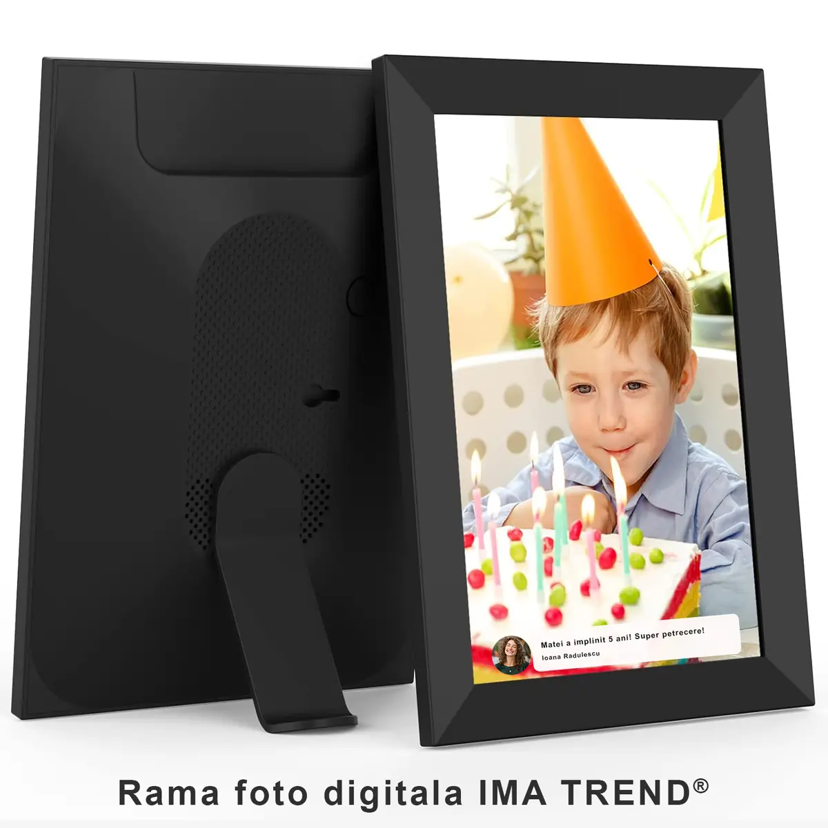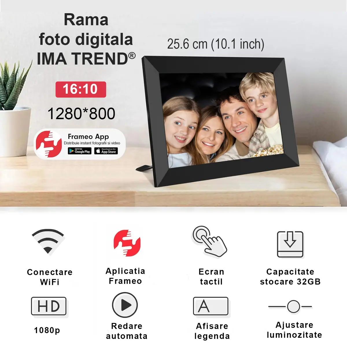 Rama foto digitala IMA Trend cu ecran IPS HD de 10.1 inch, control tactil, memorie interna 32GB, aplicatie Frameo si conectivitate Wi-Fi. Design elegant negru, difuzoare stereo, slot card SD si port TypeC – ideala pentru a primi poze si video de la cei dragi.