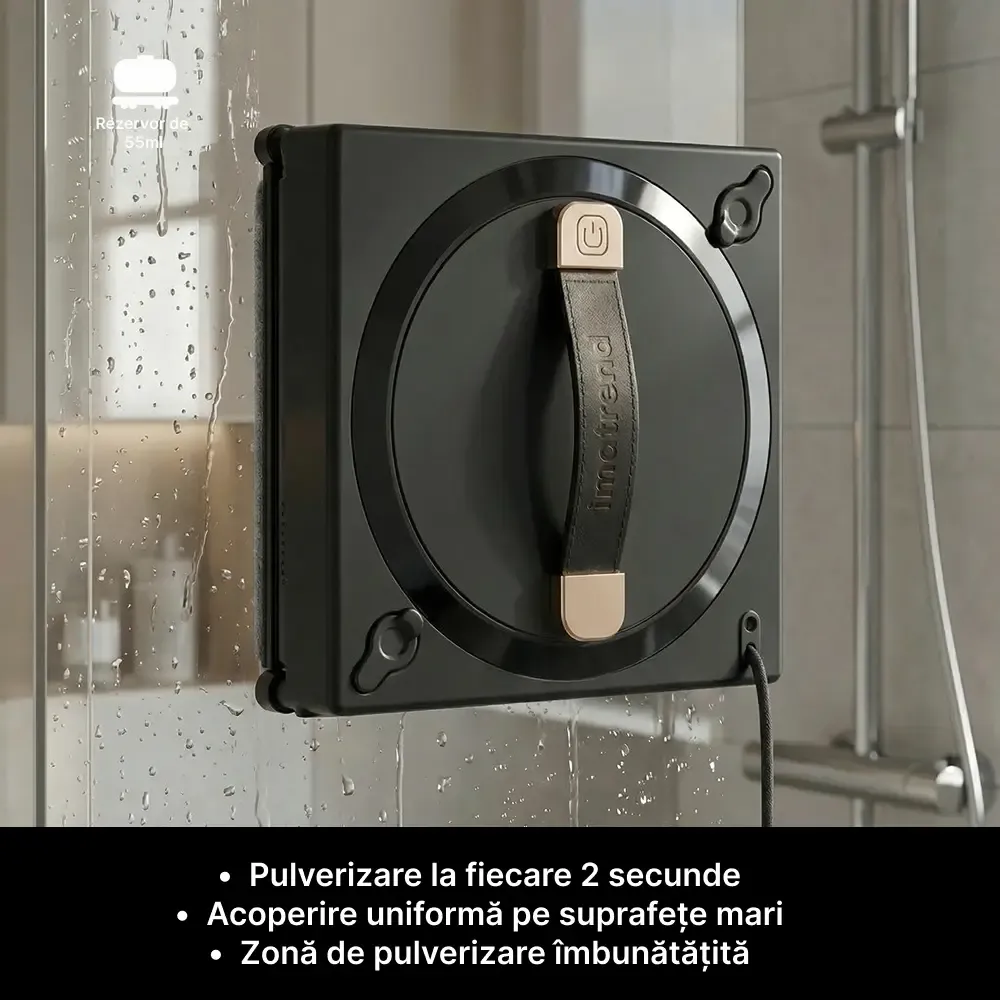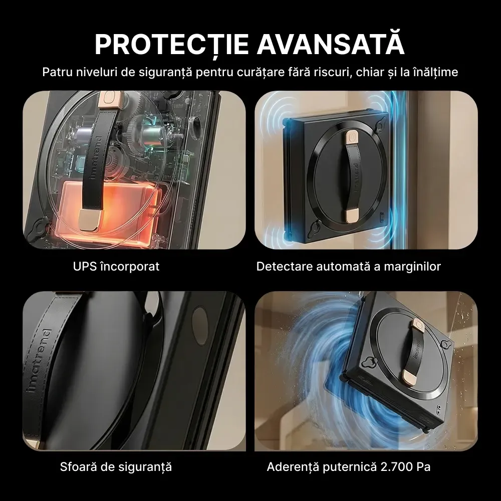 Robot curatare geamuri IMA Trend cu detectare automata a marginilor, pulverizare ultrasonica, 3 moduri de lucru, aplicatie mobila, telecomanda, 2700Pa, rezervor dublu 60ml, sistem UPS 30 minute, franghie de siguranta 4M, Negru