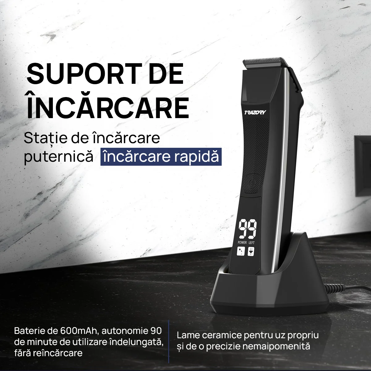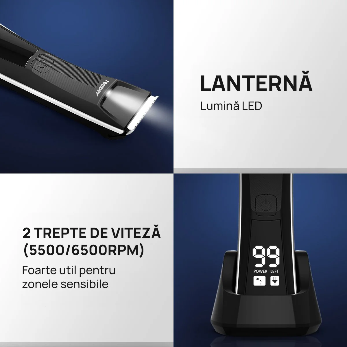 Aparat multifunctional de tuns si ras IMA Trend cu lame ceramice, rezistent la apa (IPX7), display LED si incarcare USB. Ideal pentru tuns inghinal, barba si corp. Baterie reincarcabila, lumina LED, 2 viteze si stand inclus.